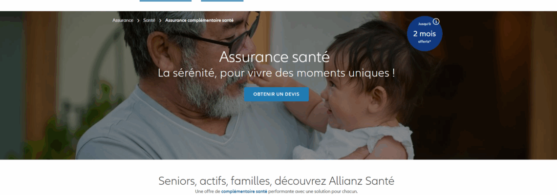 Assurance santé La sérénité, pour vivre des moments uniques ! obtenir un devis Seniors, actifs, familles, découvrez Allianz Santé Une offre de complémentaire santé performante avec une solution pour chacun. Si la santé n'a pas de prix, chez Allianz, nous affichons clairement nos remboursements !