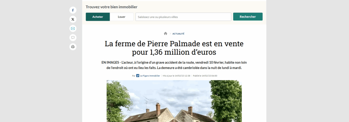 Le Figaro Immobilier Journaliste Twitter Ses derniers articles La ferme de Pierre Palmade est en vente pour 1,36 million d’euros Cette subtilité a permis à un maire de baisser l’indemnité...