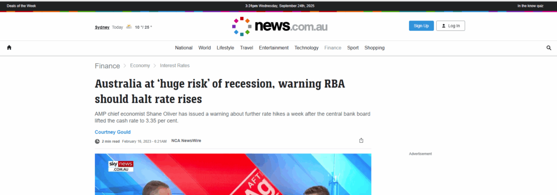 Finance; Economy; Interest Rates; Australia at ‘huge risk’ of recession, warning RBA should halt rate rises. AMP chief economist Shane Oliver has issued a warning about further rate hikes a…