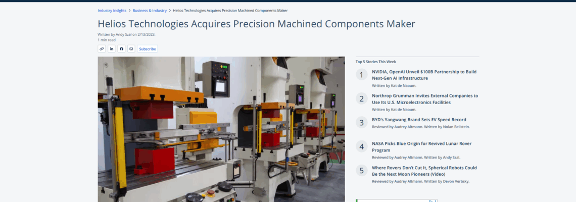 thomasnet.com | Helios Technologies Acquires Precision Machined Components Maker